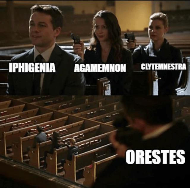 If you read #10 and #9 on my list, or if you have any experience with Greek tragedy, you know what I mean, but if you didn’t/don’t, here’s the dysfunction in a nutshell: When Agamemnon left for the Trojan War, he sacrificed his daughter Iphigenia at the behest of the goddess Artemis. His wife Clytemnestra was (understandably) pissed, and when Agamemnon returned more than a decade later, she and her new boy toy Aegisthus immediately killed him. Agamemnon and Clytemnestra’s son Orestes, who had been sent away from home as a boy, was ordered by the god Apollo to kill his mother in order to avenge his father. He returned home, reunited with his sister Electra, and – with her help – killed Clytemnestra and Aegisthus. Of course, killing one’s mother is generally frowned upon, and Orestes was immediately hounded by the Furies, goddesses of guilt and vengeance, forcing him to search for a way to rid himself of the blood guilt (which plays out differently in the different tragedians).