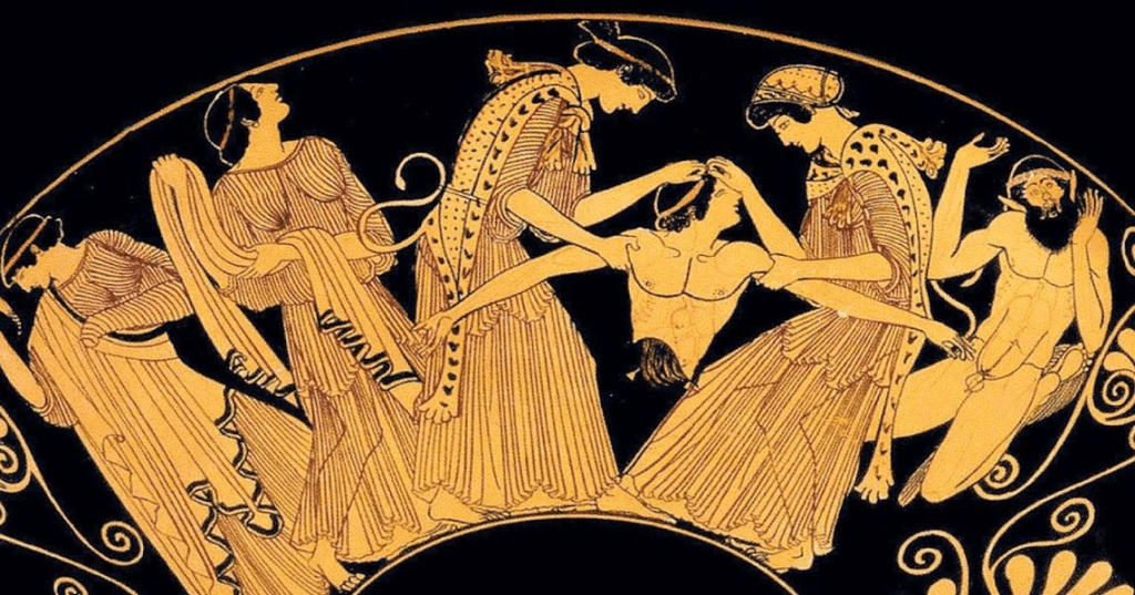 But it’s never a good idea to refuse to worship a god (as we saw in #3, Hippolytus). And the slow, sleeping, dread of this play, the inevitability of Pentheus’ demise, begins from the very start. Pentheus has imprisoned as many of the Bacchic women as he could find. Strike one. The wisest men in Thebes, the prophet Tiresias (whom we might recognize from Oedipus the King and Antigone) and Cadmus, urge Pentheus not to resist the god. Even they, old as they are, are giving in to the god’s power; indeed, they’re on their way to party when they encounter Pentheus. Pentheus shames them and criticizes their foolishness. Strike two. Dionysus himself, disguised as a mortal man, performs miracles and urges Pentheus not to underestimate the new god. Pentheus imprisons him. Strike three.